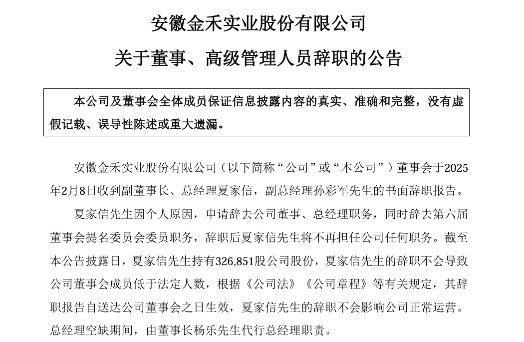 2月11日晚间,金禾实业(002597)公告,公司于2月8日收到副董事长兼总经理夏家信、副总经理孙彩军的书面辞职报告。二人因个人原因请辞,辞职后不再担任公司任何职务。