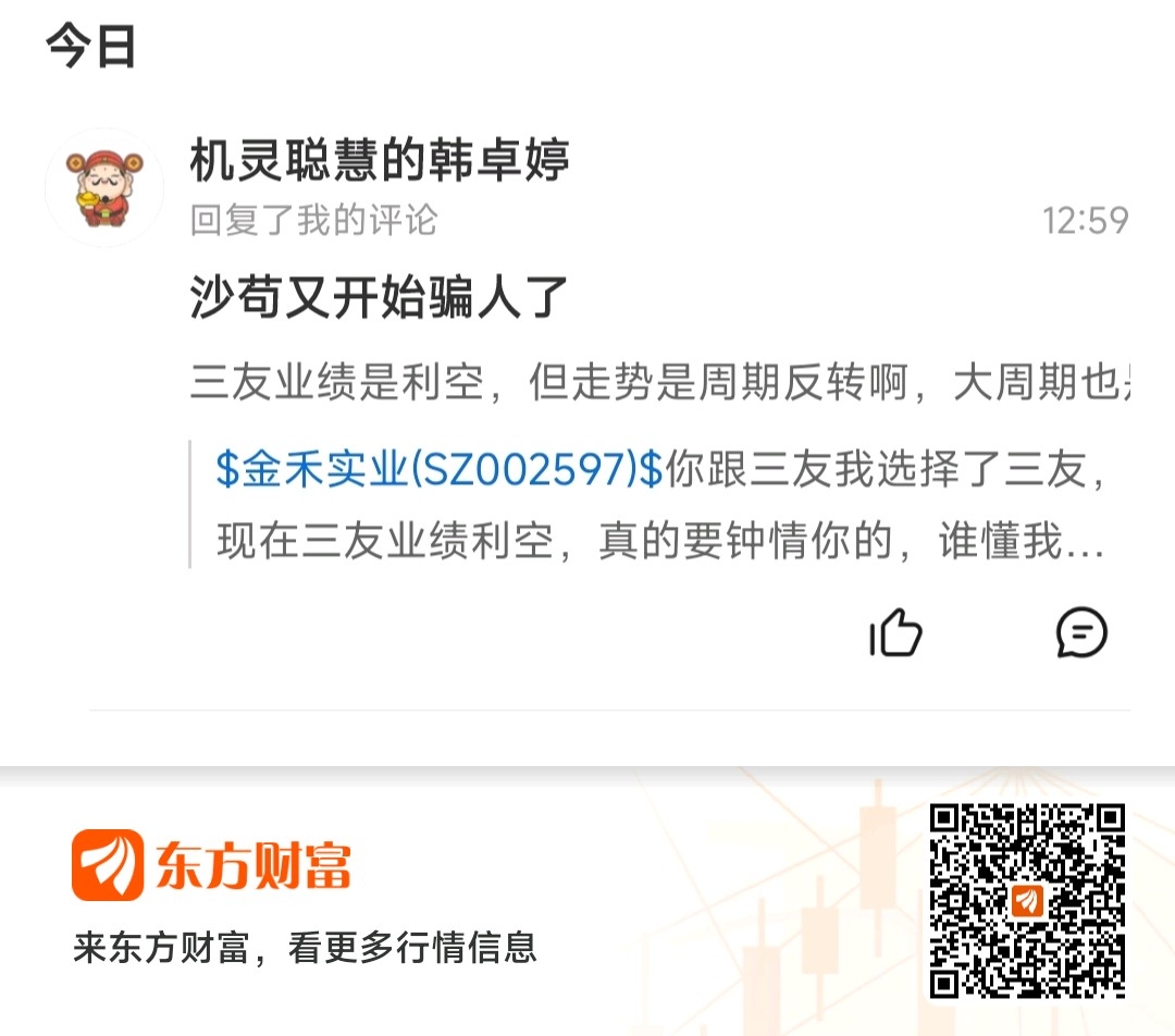 $金禾实业(SZ002597)$ 哈哈哈,骂了我然后就把我拉黑,生怕我回复他。人又怂,又要做小人。过一会他又会跳出来把我解封,然后在我的留言下骂我。所以,知道吧,古人云小人和女子不能惹