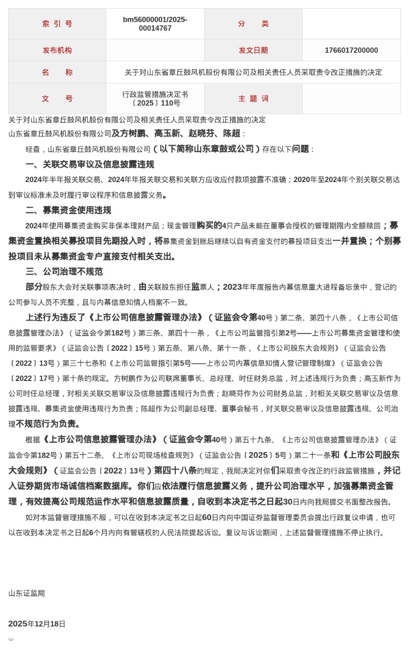 山东章丘鼓风机股份被责令改正,涉信息披露违规等