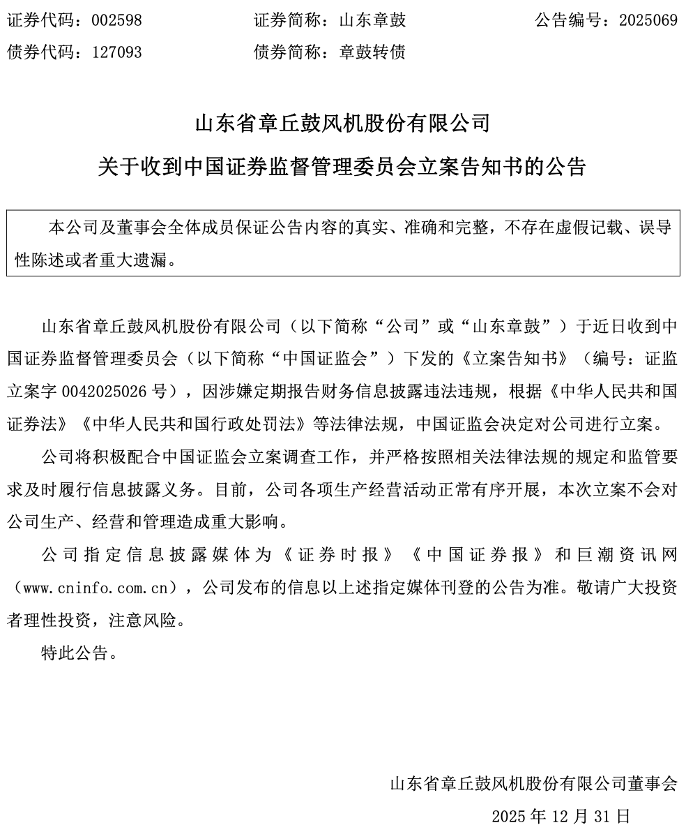 2025年12月31日,山东章鼓(002598)发布公告,公司于近日收到中国证监会下发的《立案告知书》,因涉嫌定期报告财务信息披露违法违规,根据相关法律法规,中国证监会决定对公司进行立案。