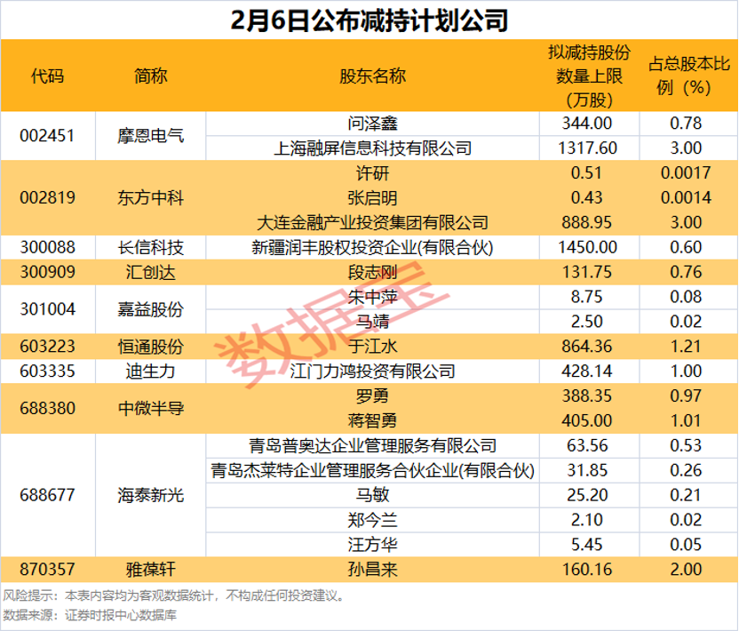 2月6日,共有10家公司披露股东减持计划,拟减持股份比例较高的有摩恩电气、东方中科、雅葆轩等。