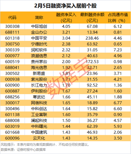 具体到个股,2月5日获融资净买入千万元以上的有592股,其中42股融资净买入额超1亿元。