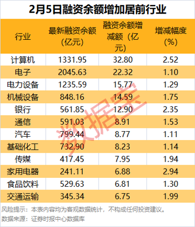 分行业统计,申万所属一级行业融资余额全部呈增加态势,计算机行业融资余额增加最多,较上一日增加32.80亿元;融资余额增加居前的行业还有电子、电力设备、机械设备等,融资余额分别增加22.32亿元、15.77亿元、14.59亿元。