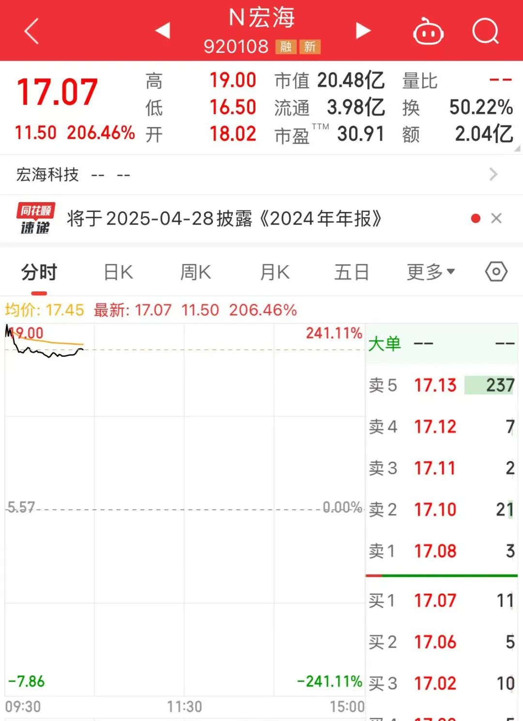N宏海(920108)今日在北交所上市,为蛇年首只新股;该股今日开盘价18.02元/股,上涨223.52%。