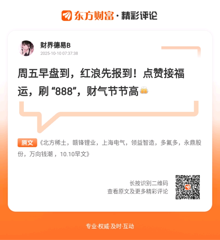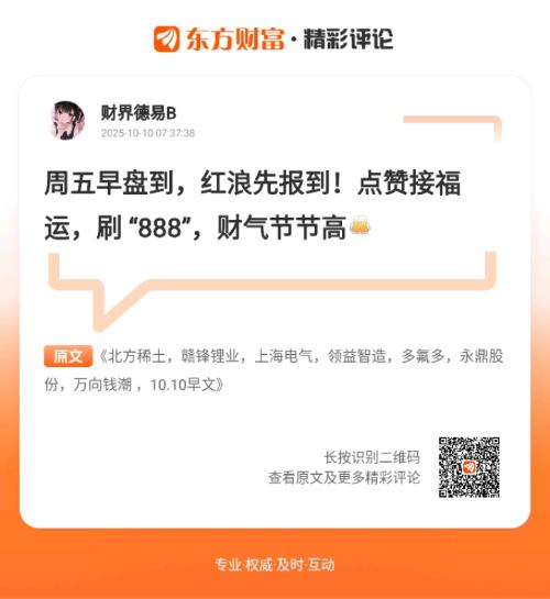 //@财界德易B :周五早盘到,红浪先报到!点赞接福运,刷 “888”,财气节节高 $领益智造(SZ002600)$$多氟多(SZ002407)$$万向钱潮(SZ000559)$老师牛