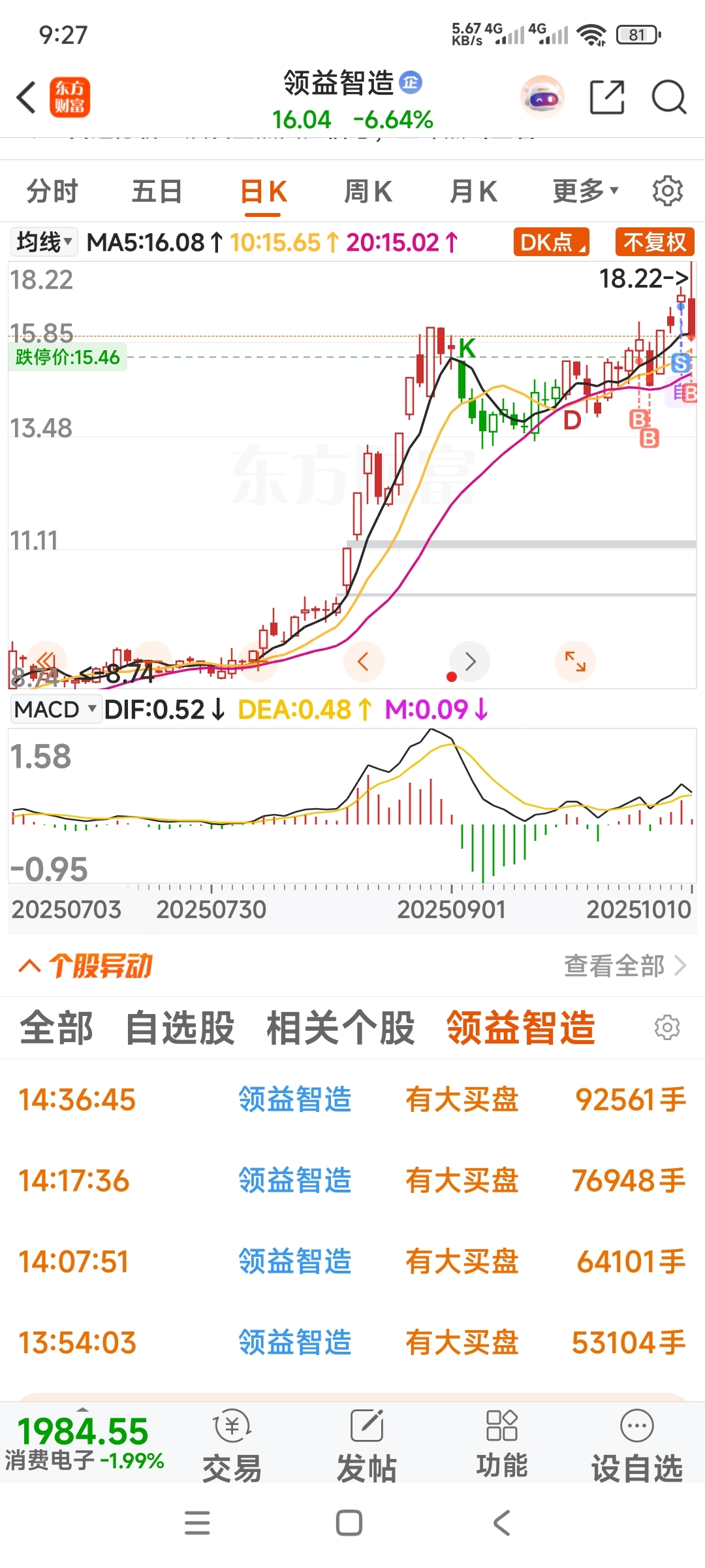 $领益智造(SZ002600)$ 昨天大跌的时候散户在跑,主力在买,这么大的单不是你我买的吧