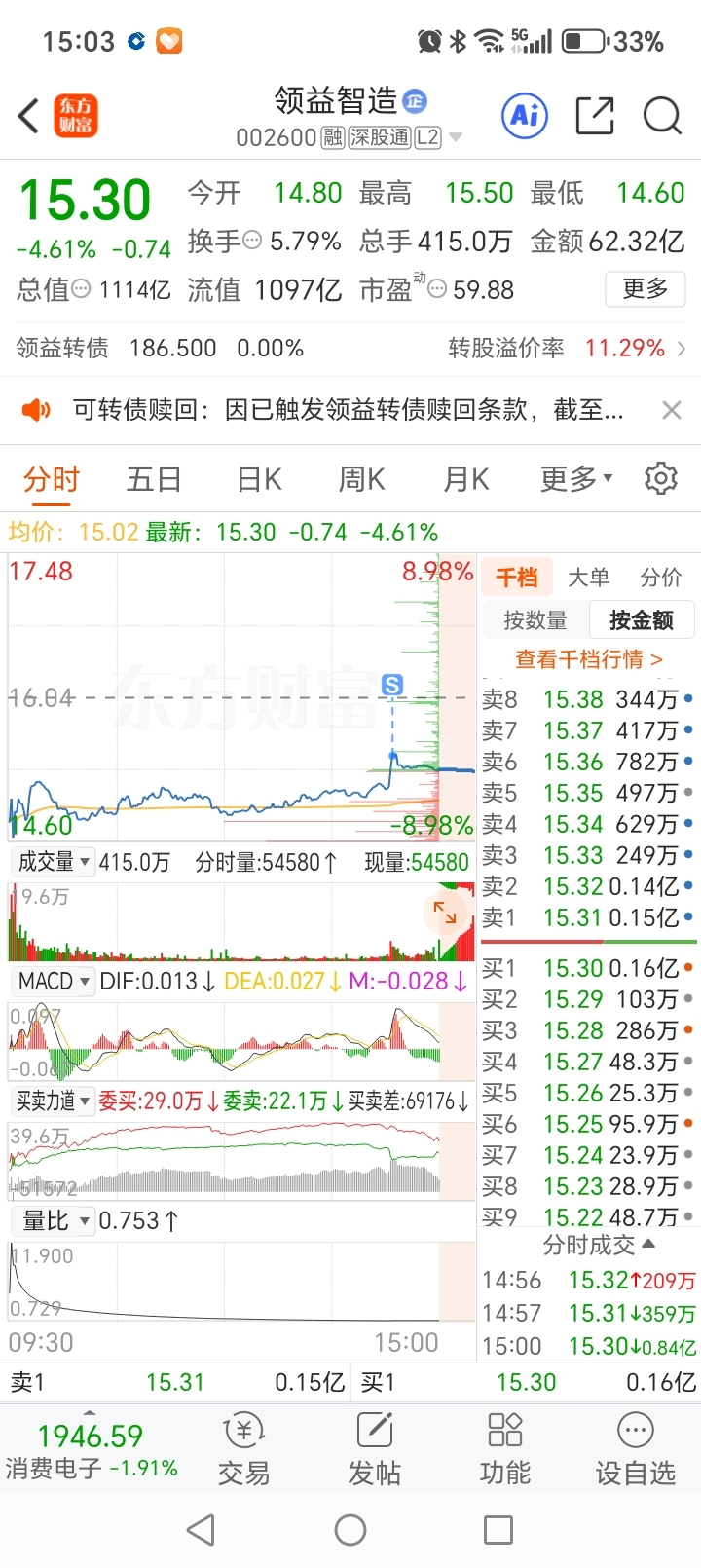 $领益智造(SZ002600)$ 走了,15.46割肉了,太大利空了