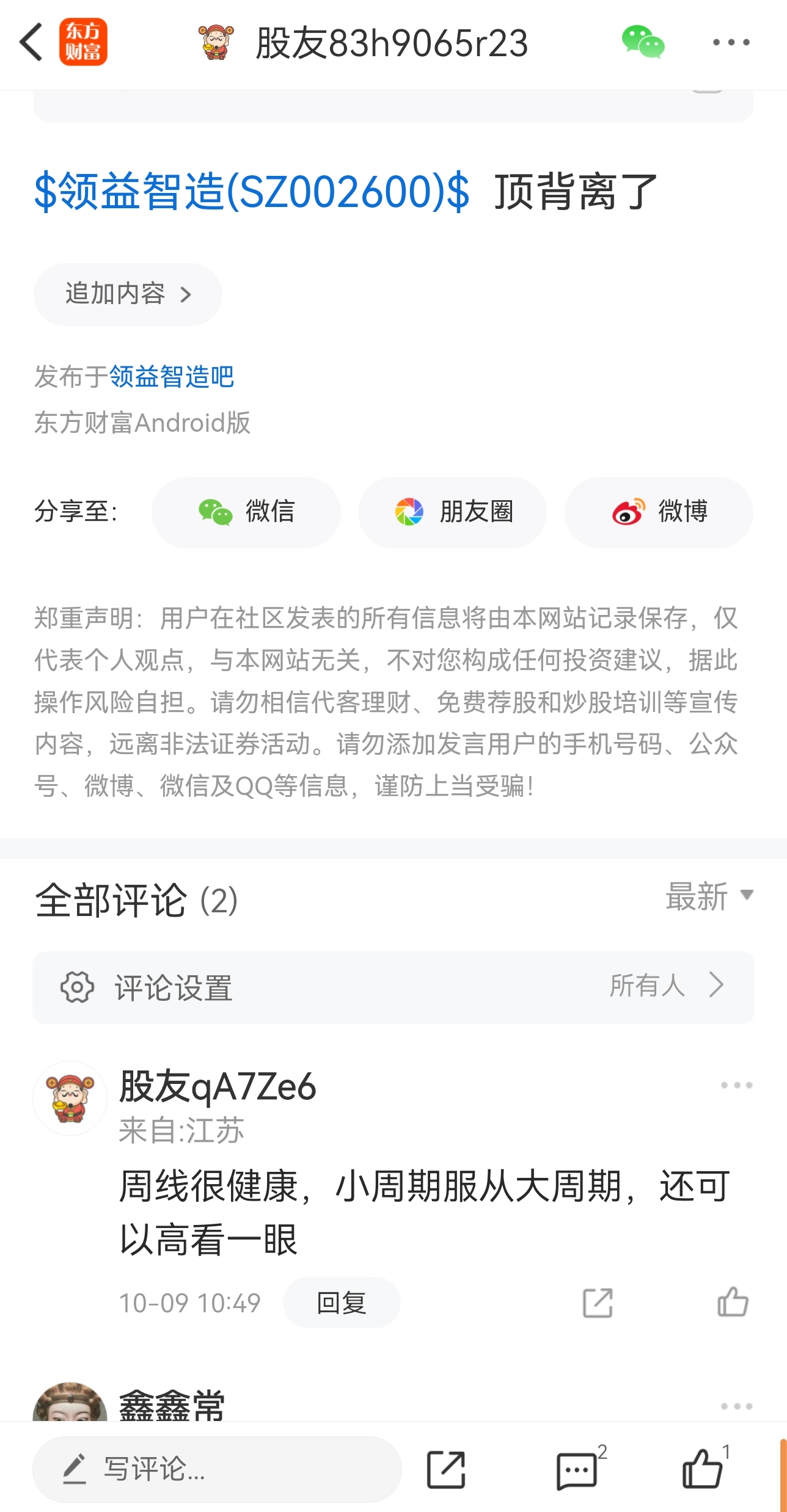 温馨提示: 1.根据《证券法》规定,禁止编造、传播虚假信息或者误导性信息,扰乱证券市场;2.用户在本社区发表的所有资料、言论等仅代表个人观点,与本网站立场无关,不对您构成任何投资建议。用户应基于自己的独立判断,自行决定证券投资并承担相应风险。《东方财富社区管理规定》