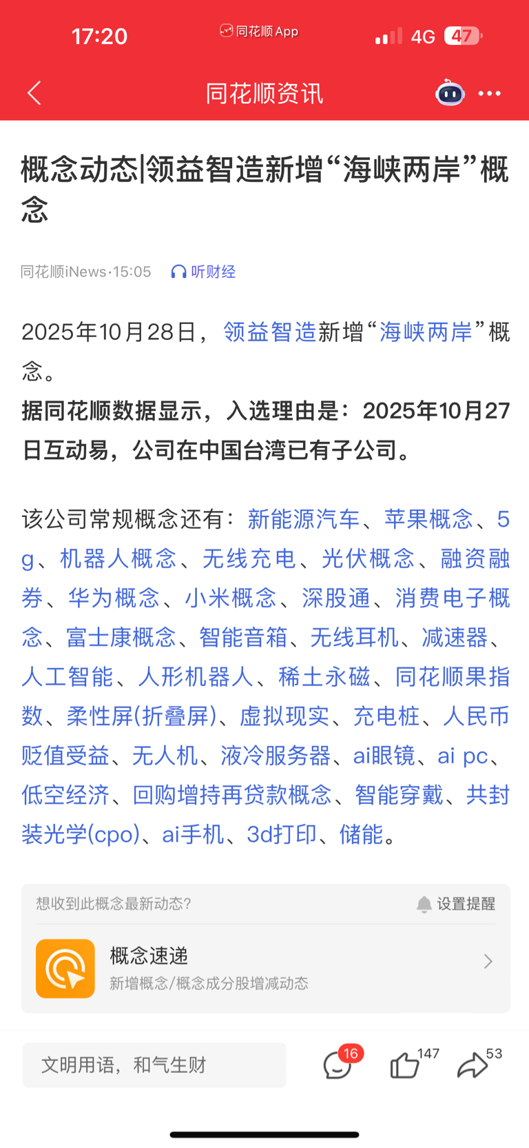 $领益智造(SZ002600)$ 新增海峡概念,明天是不是要爆拉了,可惜15.70全仓清了,不赚不赔走了,明天看看情况,要不要买回来