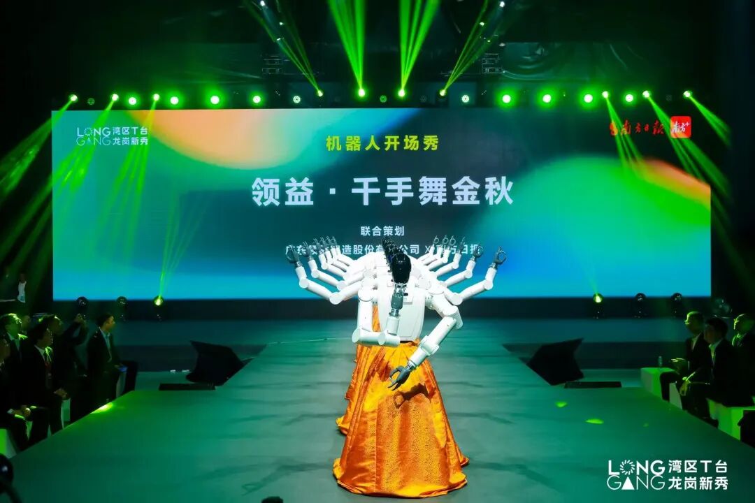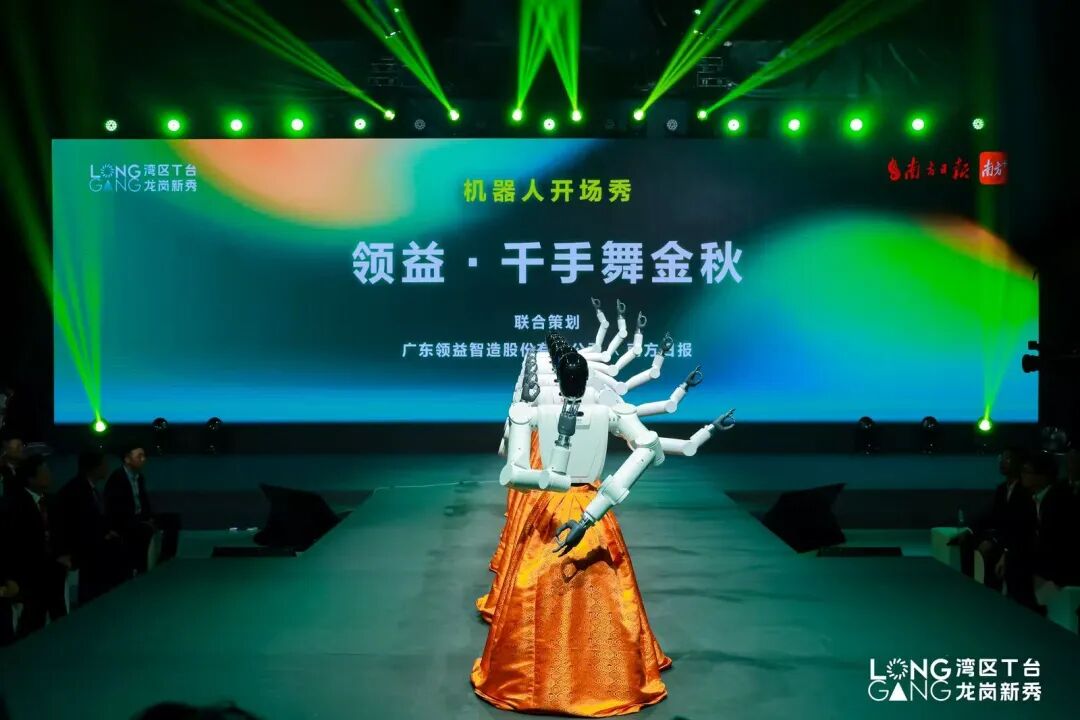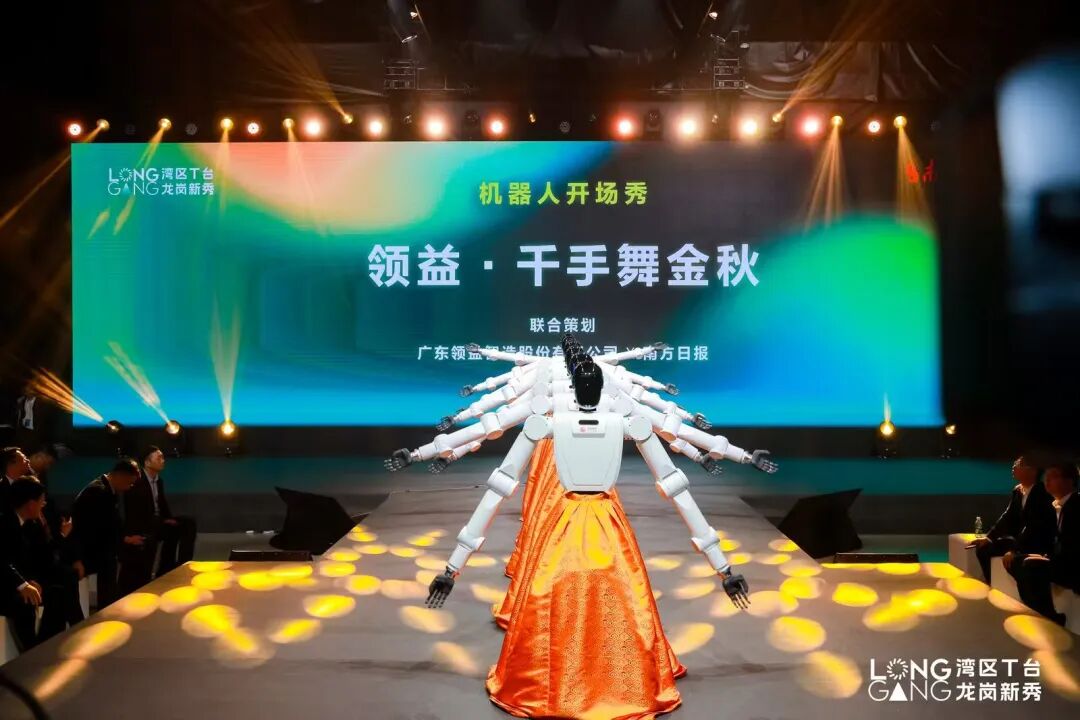 活动伊始,7台领跃机器人以一曲《领益·千手舞金秋》震撼开场,整齐划一的动作、极具张力的视觉呈现,瞬间点燃全场。作为柔性运动典范,“领跃”机器人通过百余次精准关节联动再现“千手观音”神韵,凭借高度协同的动作控制与精准的节奏把握,将传统艺术与前沿科技完美融合。
