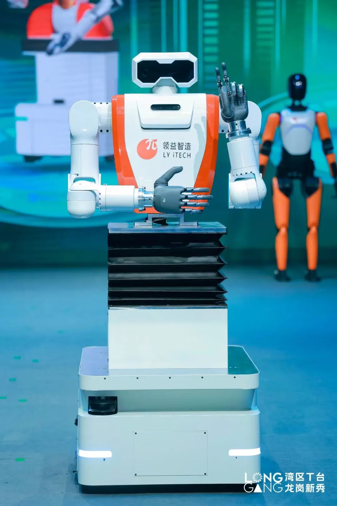 紧随其后的磐石机器人,诠释了“稳如磐石,力扛千钧”的工业属性。它双臂协同负载达20kg,单臂重复定位精度高达0.05mm,搭载智擎OS2.0系统与激光雷达融合导航,在搬运、码垛等任务中无缝切换。双模供电系统保障5小时不间断作业,其背后是领益智造机器人“核心技术-硬件服务-场景落地”的完整闭环。