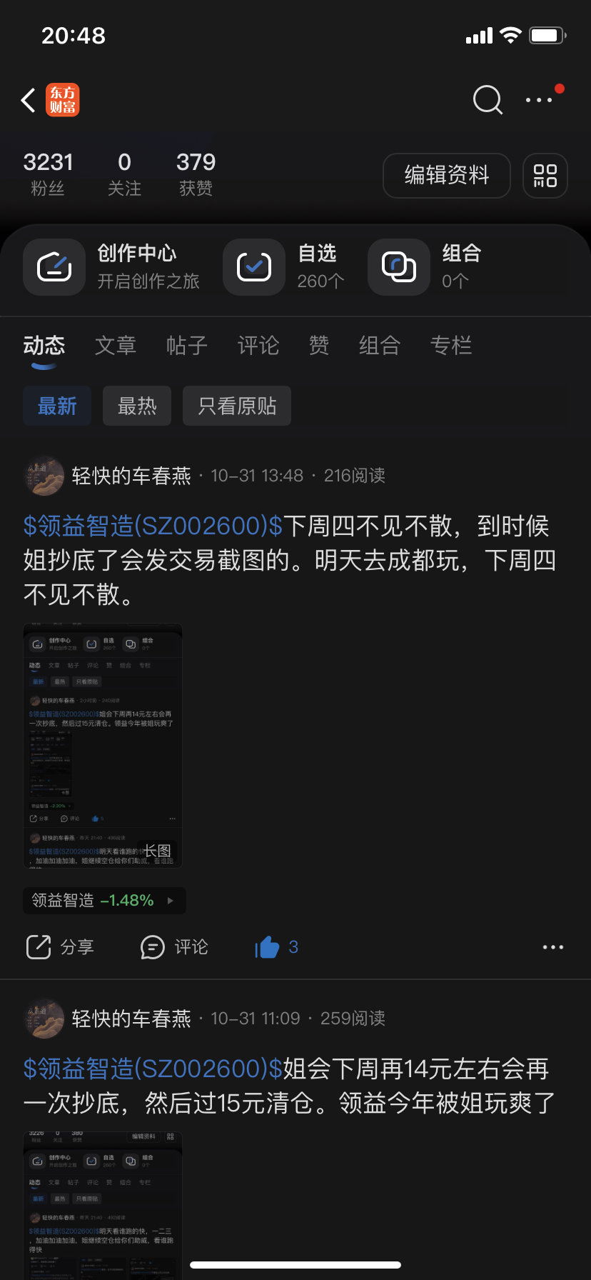 $领益智造(SZ002600)$ 姐从成都早上回来了,去玩了几天。真心喜欢成都人以及四川人。经济发展的很好人们素质也很高。非常攒。姐从上周就是本周股价会到14元左右,本来明天要抄底的结果早上的走势让姐果断今天抄底了六成仓位,成交价格14.39元。姐这次最多持股不超过10个交易日就会清仓。目标价位15.6元附近就清仓。记住11月份就是要学着慢慢离场的时候,明年初行情会继续震荡上涨的。