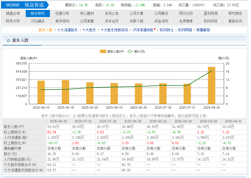 领益智造。7月30号到9月30号。股东人数从29.53万人。增加到53.91万人。这股价可以说难以上涨了。