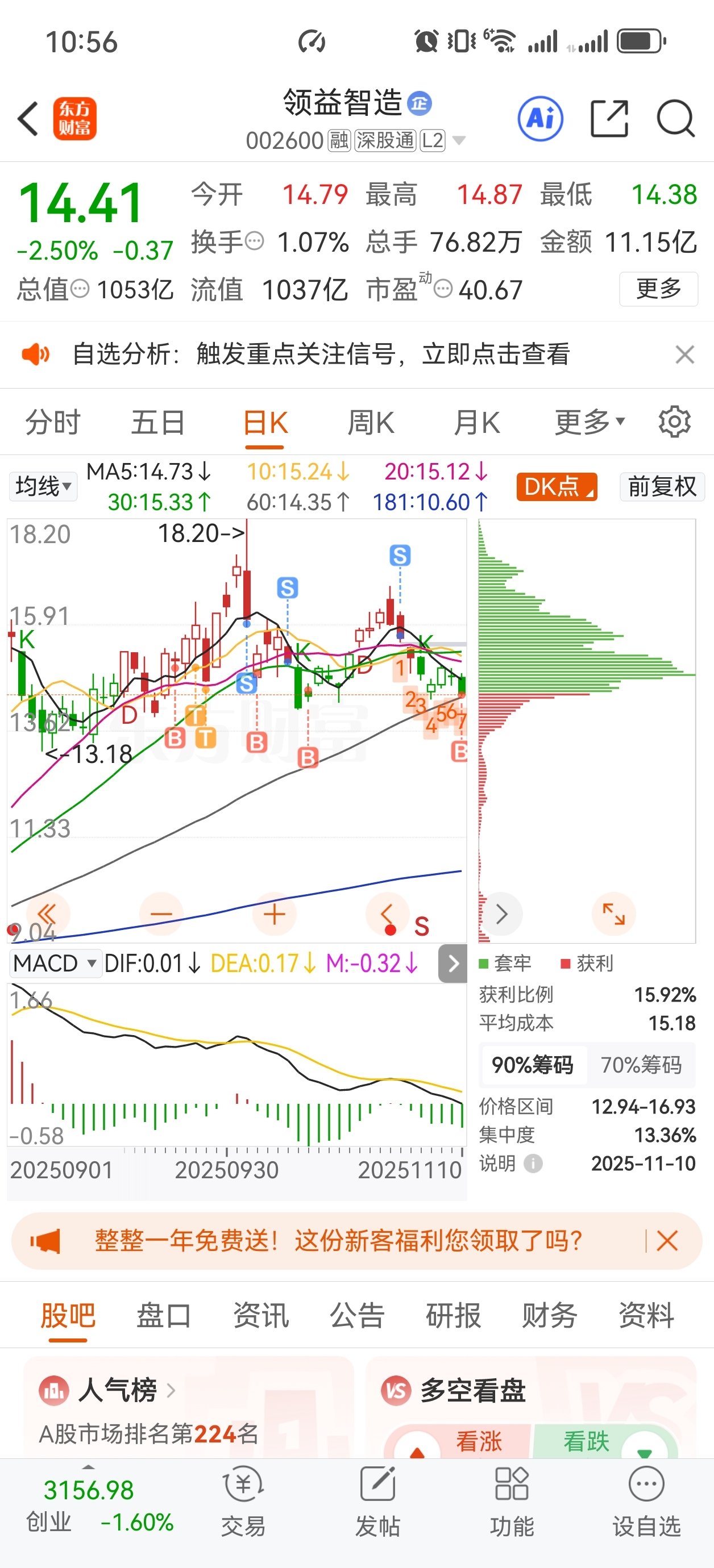 $领益智造(SZ002600)$ 14.4又回来啦,不破14就会拉升破14就止损