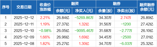 融资方面,当日融资买入4.17亿元,融资偿还4.69亿元,融资净偿还5269.86万元。融券方面,融券卖出5.31万股,融券偿还2.57万股,融券余量34.3万股,融券余额538.51万元。融资融券余额合计26.89亿元。