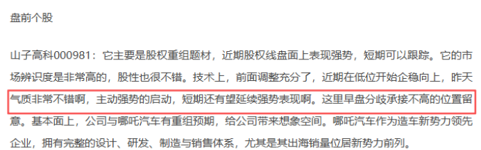 山子高科000981:它昨日如期启动张停,表现非常强势啊,更主要的是完全符合坤哥前面的预判啊。近几日坤哥连续分析了它,讲了它属于强势震荡,还有望波段走强,实际上果然是这样啊,这就是对强势谷的理解力啊。接下来的思路,继续在五均线上方跟踪反弹行情,不破五均线行情就不轻言结束啊,继续多些耐心。山子高科,是坤哥节前最后一日早文分析的,当时讲了公司与哪吒汽车有重组预期,给公司带来想象空间,技术上低位已经企稳,有望延续强势表现。实际上,分析非常及时啊,近期如期走强。