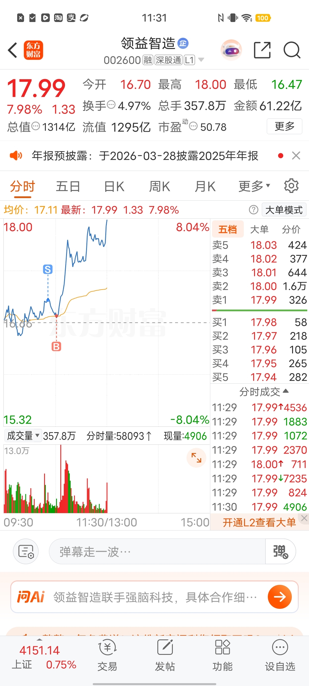 $领益智造(SZ002600)$ 拉升前做了T。还好上车了