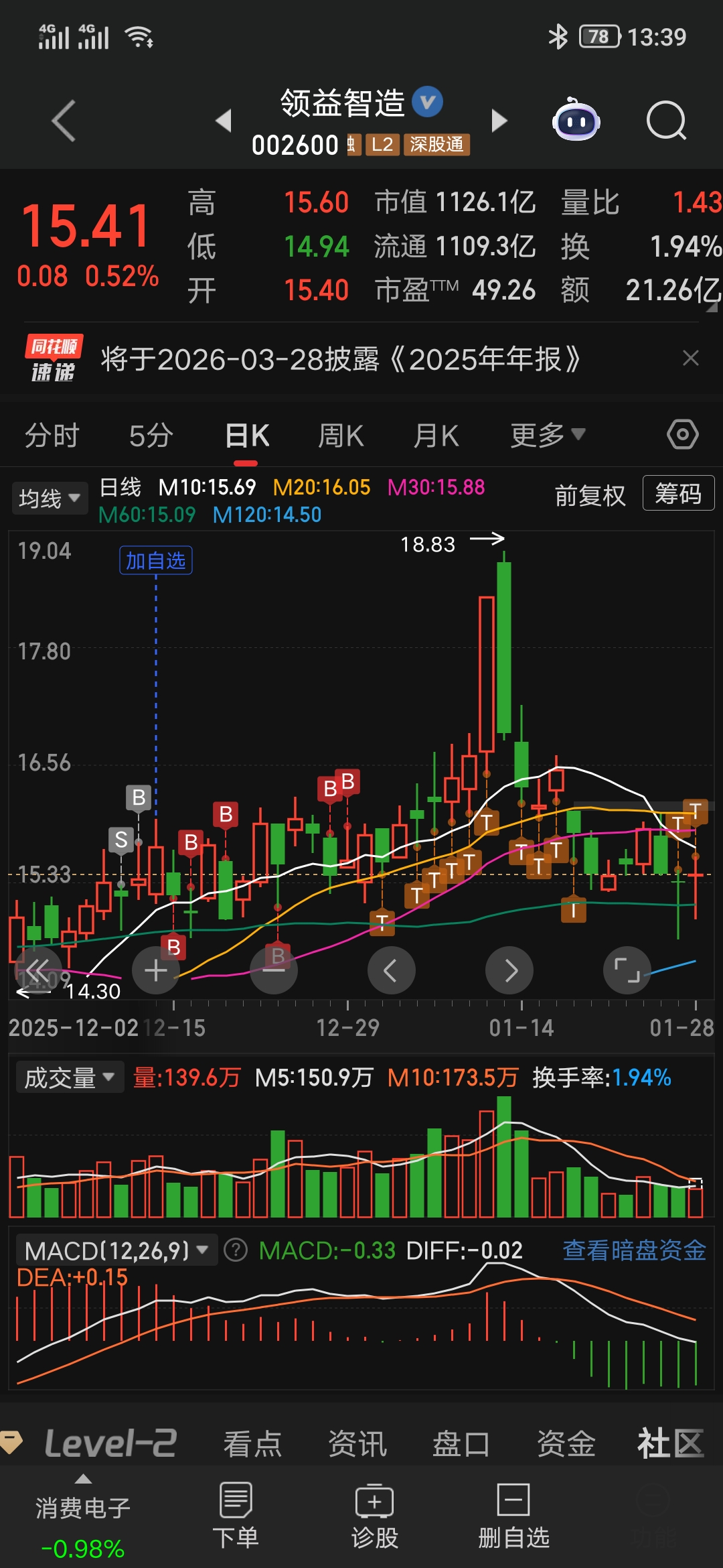 ,今天水下继续吸,跟着主力干,吃得多,我就T出一半买入的。我反正是最高点卖出一半,一直等到昨天才加仓,虽然只加到14.90,没加到最低,但卖在了15.4