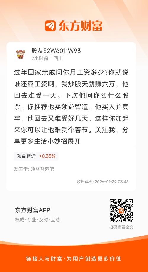 过年回家亲戚问你月工资多少?你就说谁还靠工资啊,我炒股天就赚六万,他回去难受一天。下次他问你买什么股票,你推荐他买领益智造,他买入并套牢,他回去又难受好几天。这样你加起来你可以让他难受个春节。关注我,分享更多生活小妙招展开