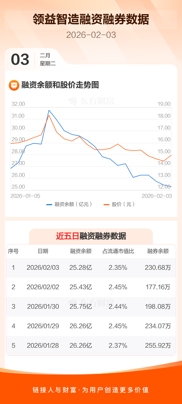 交易所最新数据显示,领益智造于2026年2月3日获融资买入1.33亿元,融资偿还1.49亿元,当日融资净偿还1523.96万元。目前,该股融资余额25.28亿,占流通市值比例为2.35%。