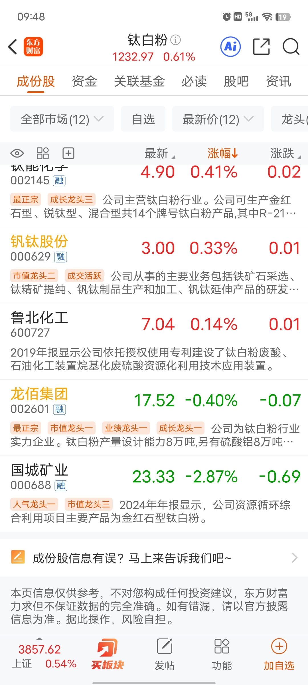 $龙佰集团(SZ002601)$ 钛白粉板块倒数第二,这个还算龙头??
