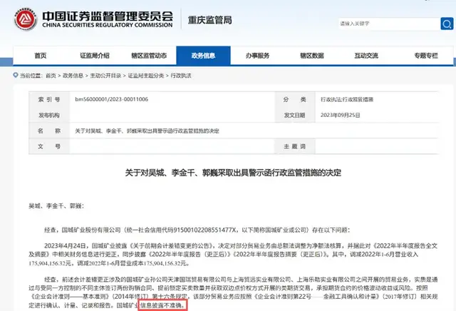 更令人警惕的是,国城在现金流恶化、存货上升、主业亏损的情境下,资产减值损失仍维持较低水平,因此存在减值异常现象。此外,公司此前就曾因信息披露方面存在瑕疵而被证监会出示过《警示函》,其风险信号已亮红灯。