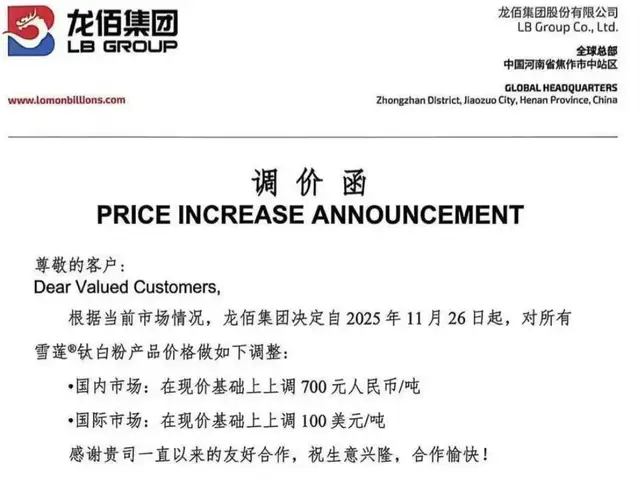 11月26日,#钛白粉 龙头$龙佰集团(SZ002601)$率先宣布国内产品每吨涨价700元,海外涨100美元。消息一出,#钛能化学(002145)、#道恩股份(002838)、#安纳达(002136)等20多家企业迅速跟进,连特诺、康诺斯这些外资巨头也坐不住了。年末这波钛白粉集体涨价,来得又快又猛。