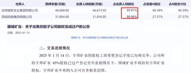 国城的问题远不止亏损这么简单。前两大股东质押率均超99.9%,总质押比例高达67.96%,几乎把全部持股都拿去融资,股票面临极高的抛售风险。2024年,公司高调宣布要收购亚洲最大银矿宇邦矿业,市场一度幻想它要打造稀贵金属平台,结果2025年突然反手卖掉65%股权,套现7.86亿元,这极有可能是公司由于财务困境而放弃了之前的战略布局。