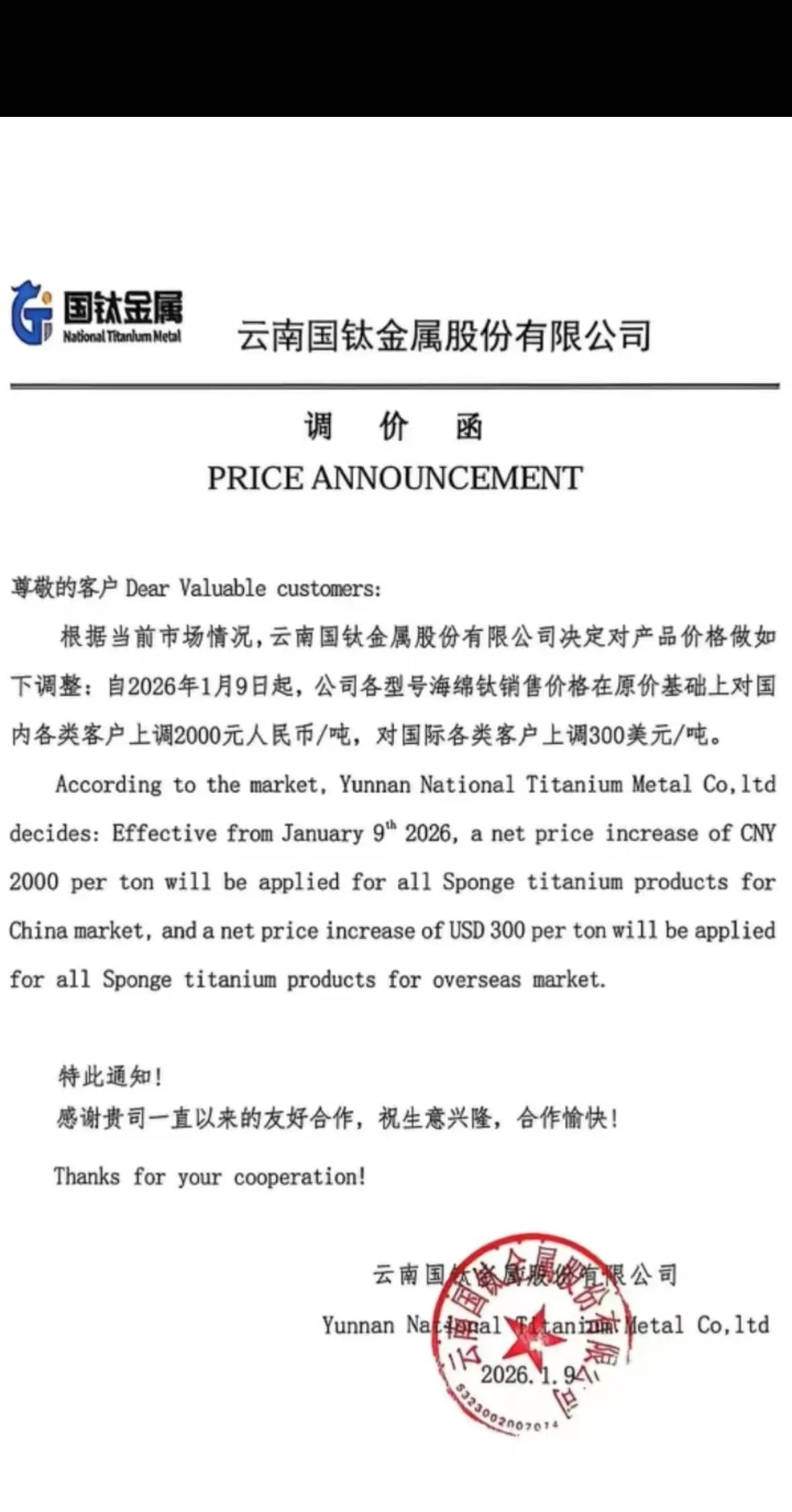 $龙佰集团(SZ002601)$ 航空金属,继续涨价,周末给大家一个惊喜