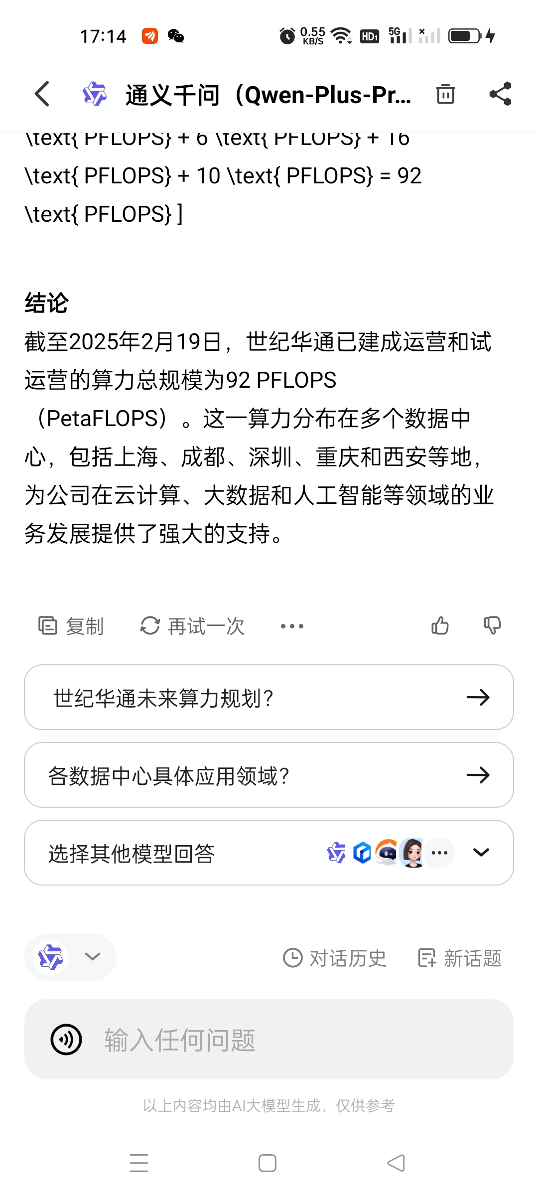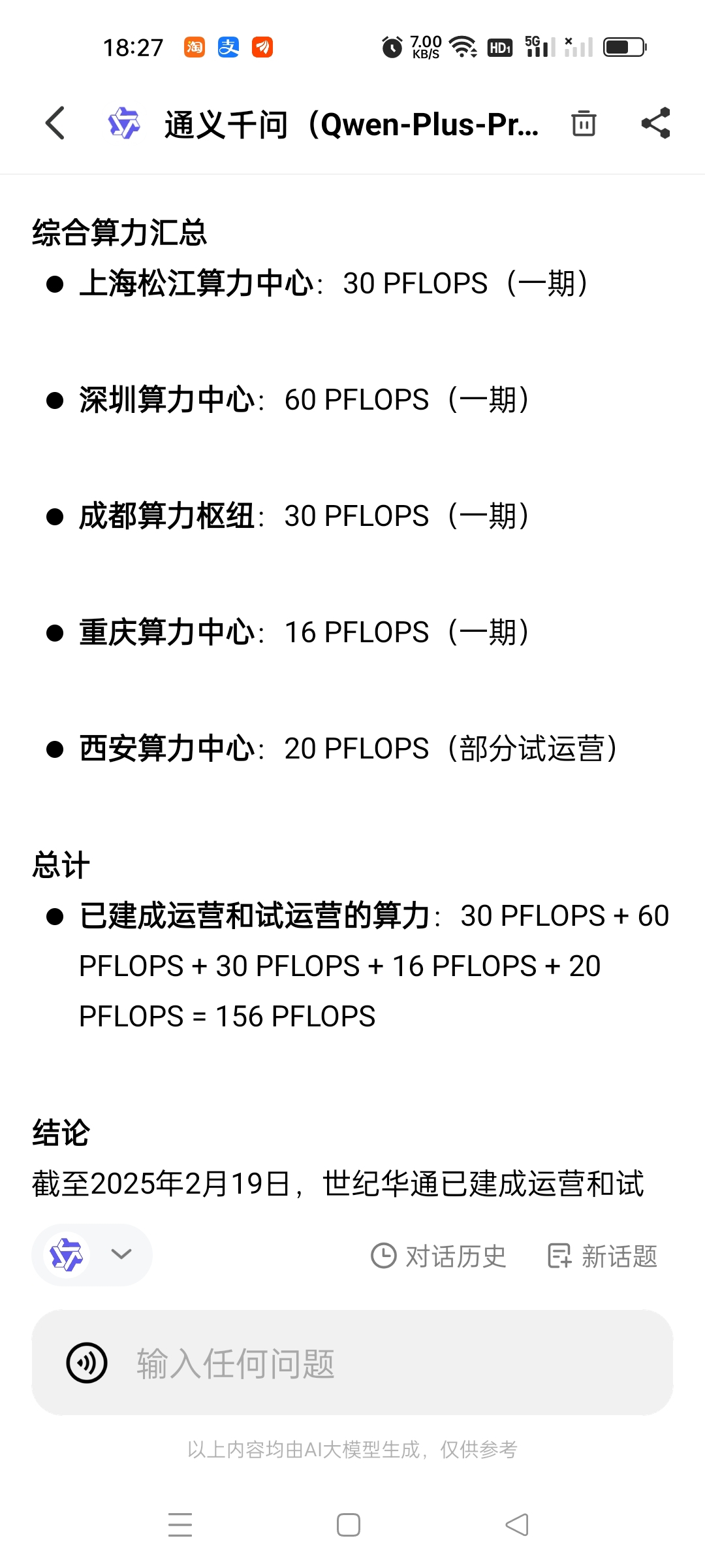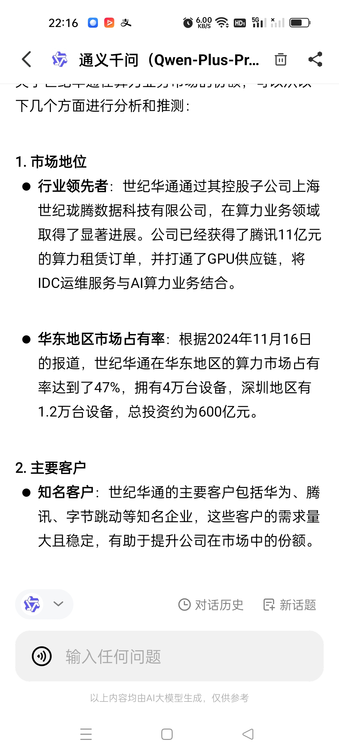 根据通义千问的估算,成都算力枢纽一期投入20亿,每年可产生收入10亿元,得益于当地的低电价和华通的先进技术,一年电费仅不到5千万,工资加维护费约5千万。那么如果算力出租效率为80%,毛利可达到7亿!