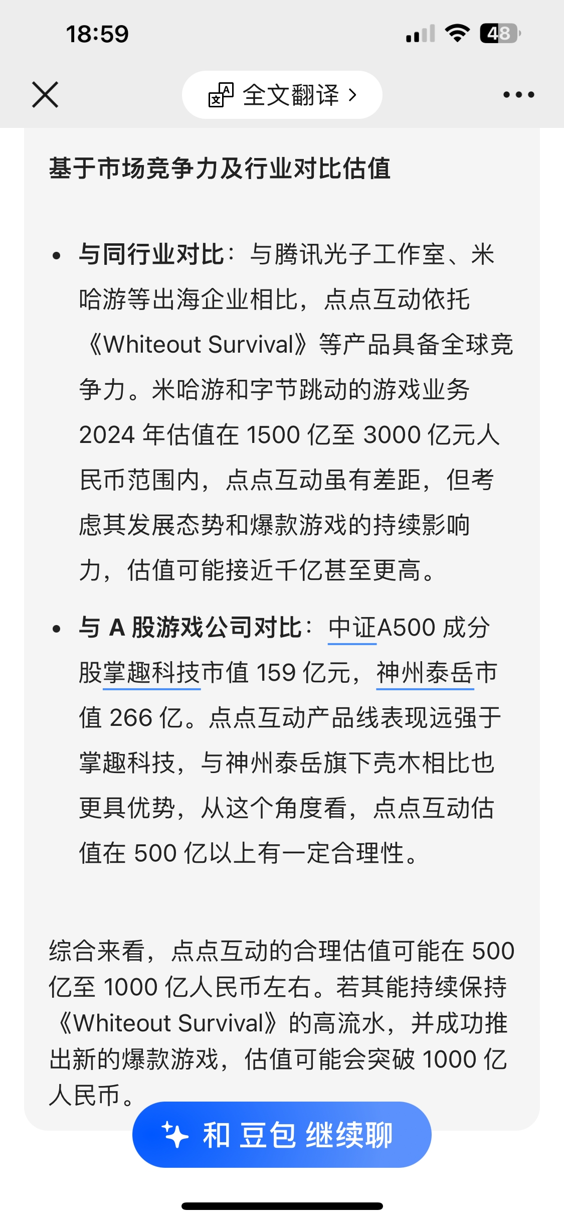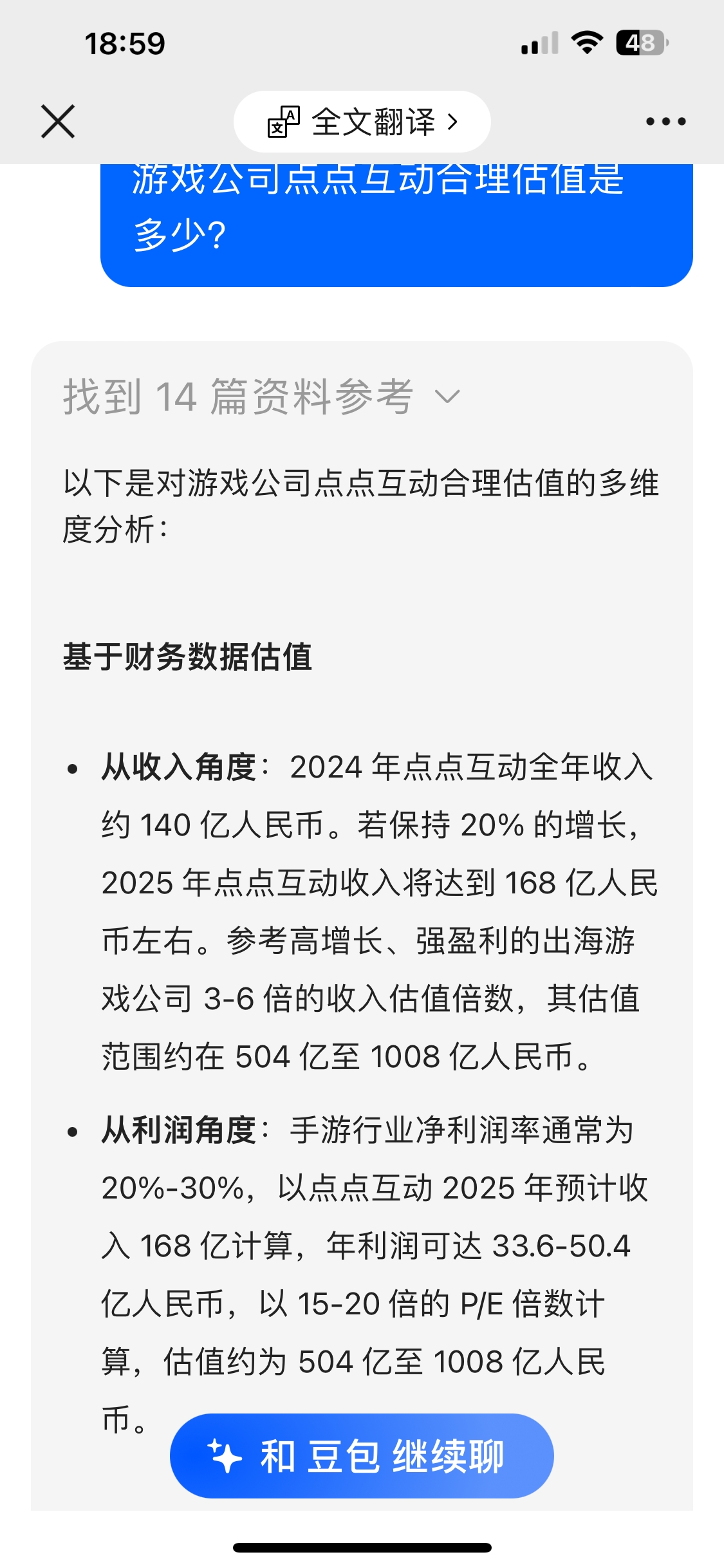 豆包答复:游戏公司点点互动合理估值是多少?
