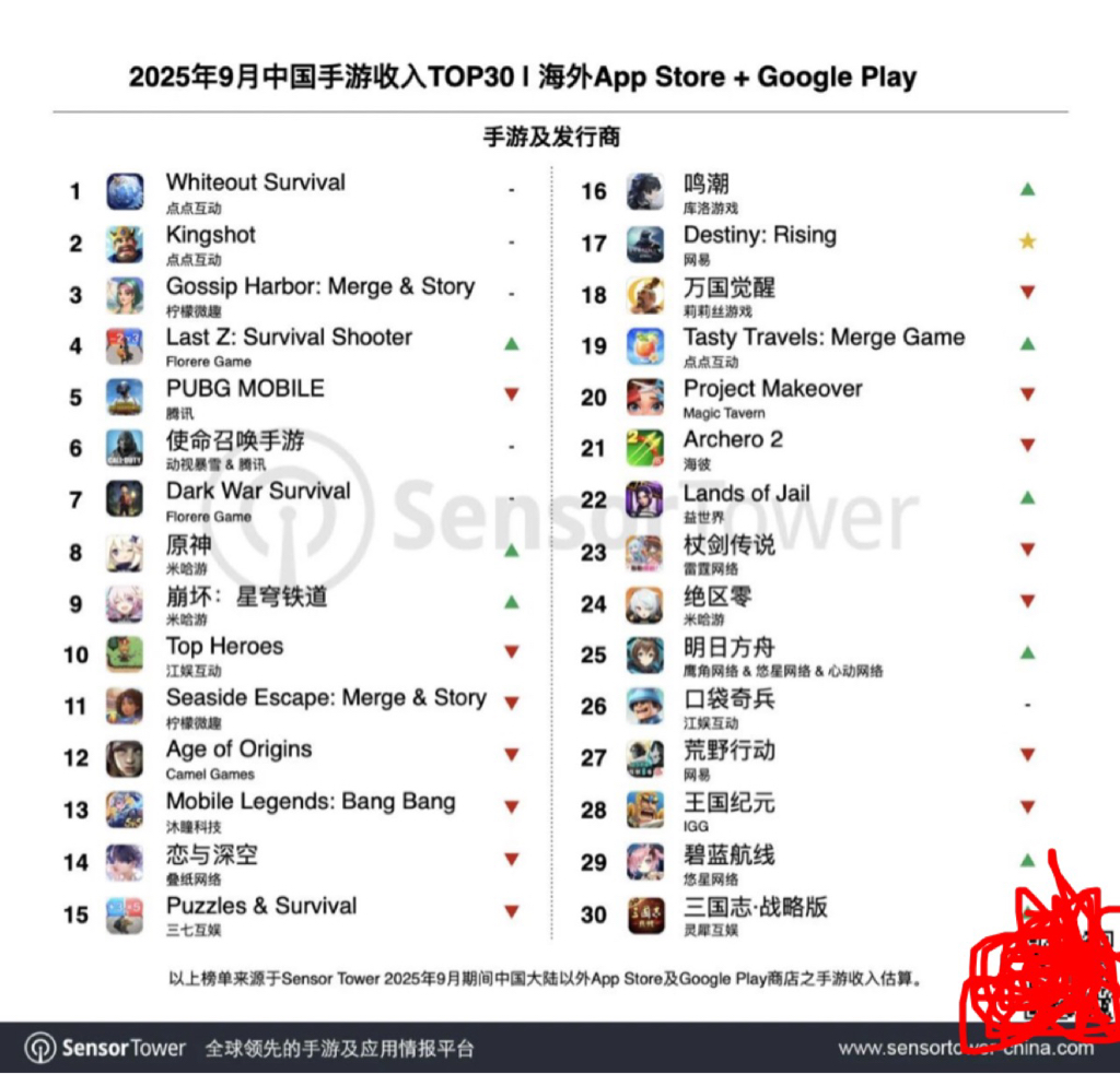 $ST华通(SZ002602)$ 9月份出海手游华通的两个爆款继续位列冠亚军。《Tasty Travels: Merge Game》保持强劲增长势头,9月收入环比再涨26%。来到了第19名……可是看着外围这鸟样……周一是不是该减点仓位呢……