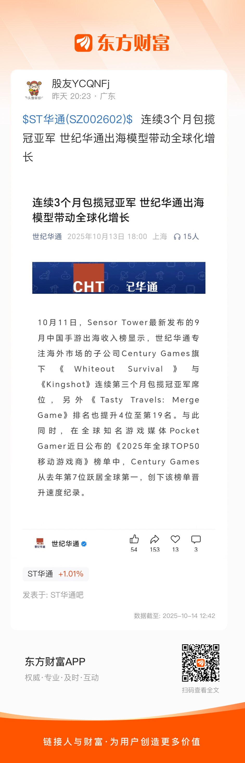 $ST华通(SZ002602)$  连续3个月包揽冠亚军 世纪华通出海模型带动全球化增长
