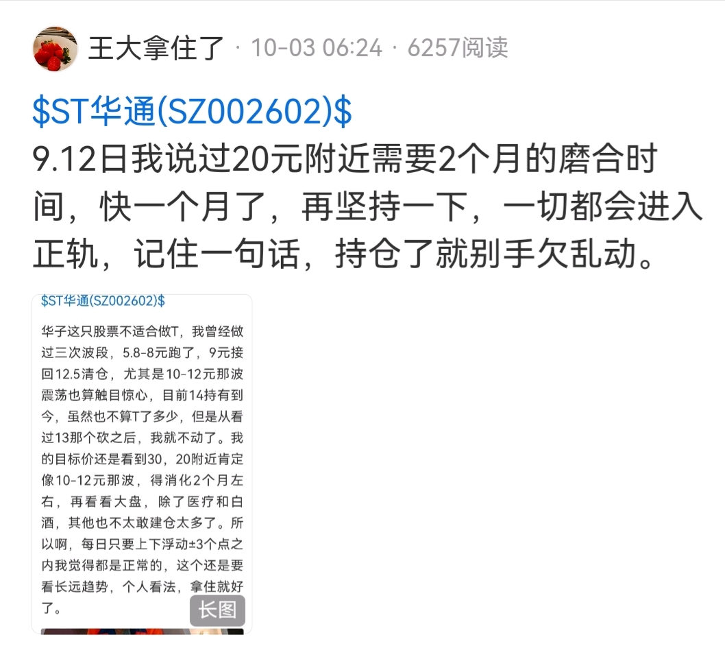 $ST华通(SZ002602)$ 9.12日我说过20元附近需要2个月的磨合时间,还有20多天了,再坚持一下,一切都会进入正轨,记住一句话,持仓了就别手欠乱动。