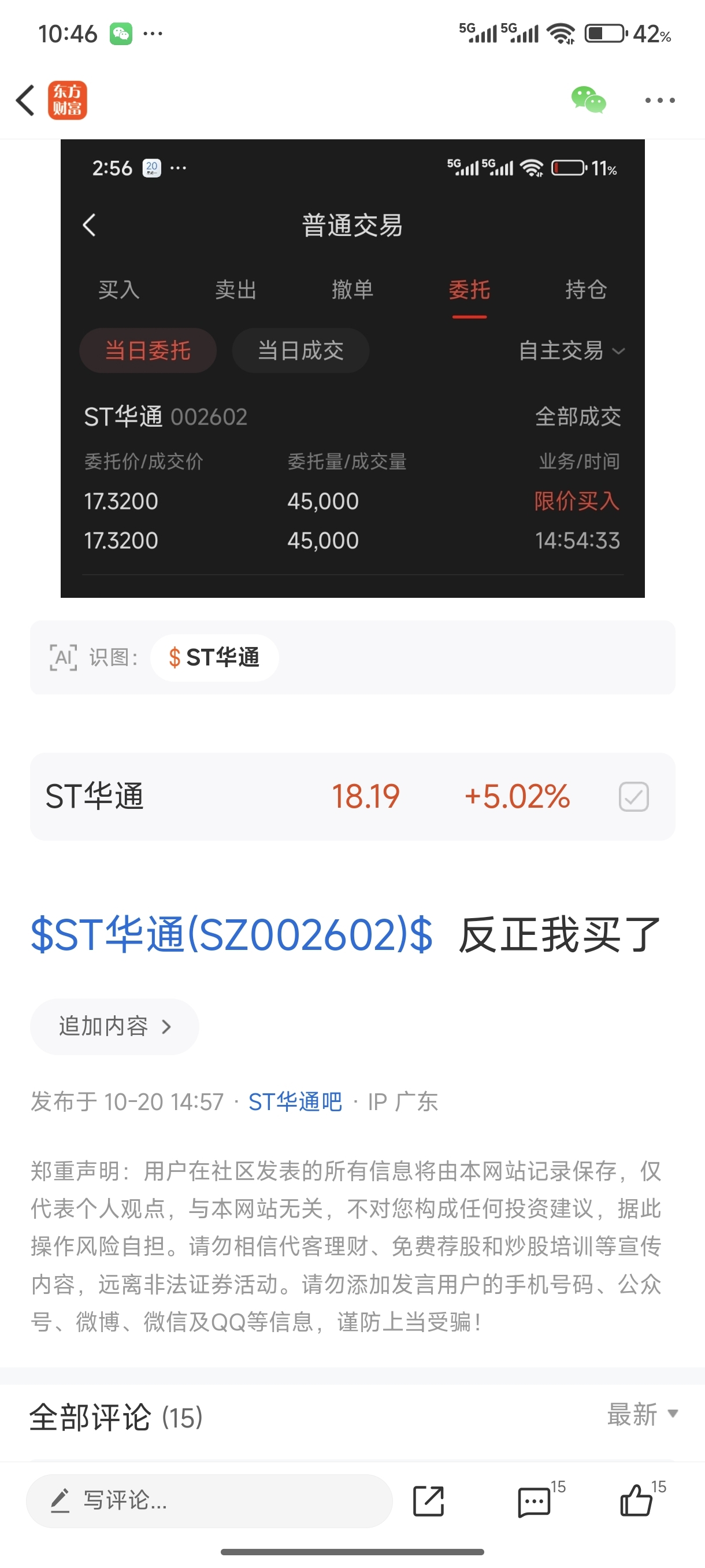 $ST华通(SZ002602)$ 昨天收市发帖。持有的共勉,唱空的留点人情,大家一起发财。