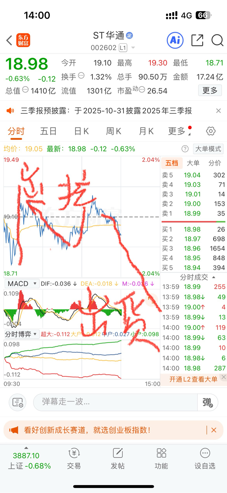 $ST华通(SZ002602)$ 哈哈,看好了, 就是这个趋势 ,现在不跑,明天大单封死,直接下砸4个点