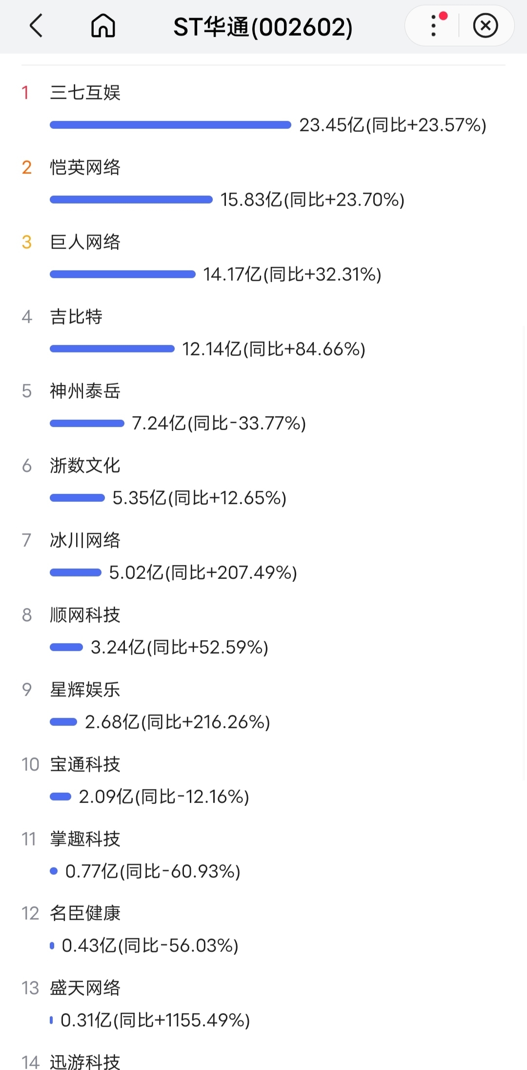 $ST华通(SZ002602)$ 业绩吊打第二名快2倍,第四名3倍,所以你们还想怎样,到底想怎样,而且游戏股就算第三,前面两家A股都没上市,那不就是妥妥的第一。算力深圳上海松江投资几百亿,还有脑机接口未来产业也深耕几年等等大家应该比我清楚,毕竟我炒股是打酱油的,大家如果有不同意见,我觉得你们有道理,但是别说,谢谢!!最后想说华通好便宜
