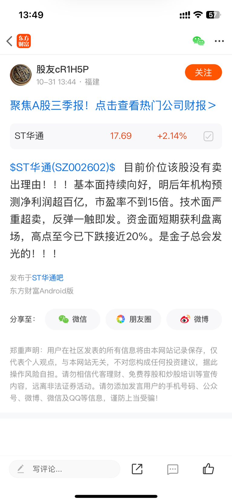$ST华通(SZ002602)$ 这个狗托 每次发帖必跌 十次十次这样 还不给人评论 小号