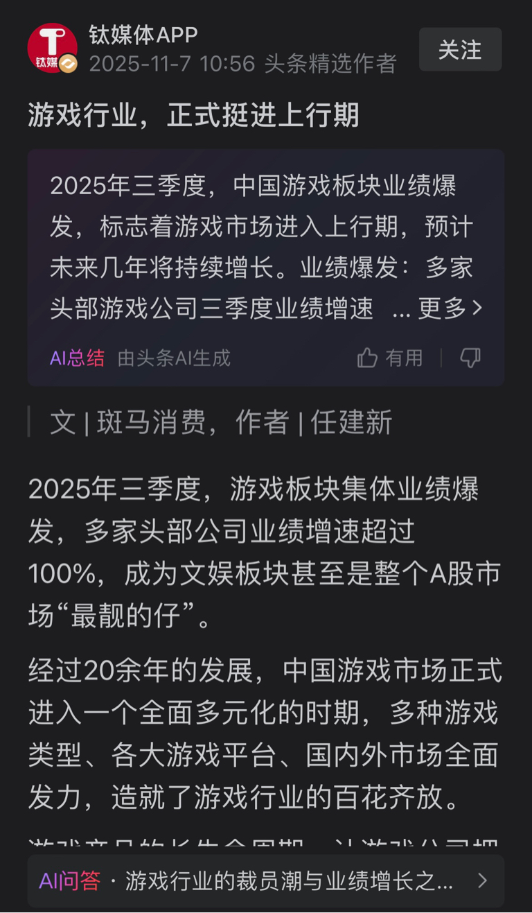 游戏行业,正式进入上行期。华通坐稳A股头把交椅。今年三季度,世纪华通营业收入10