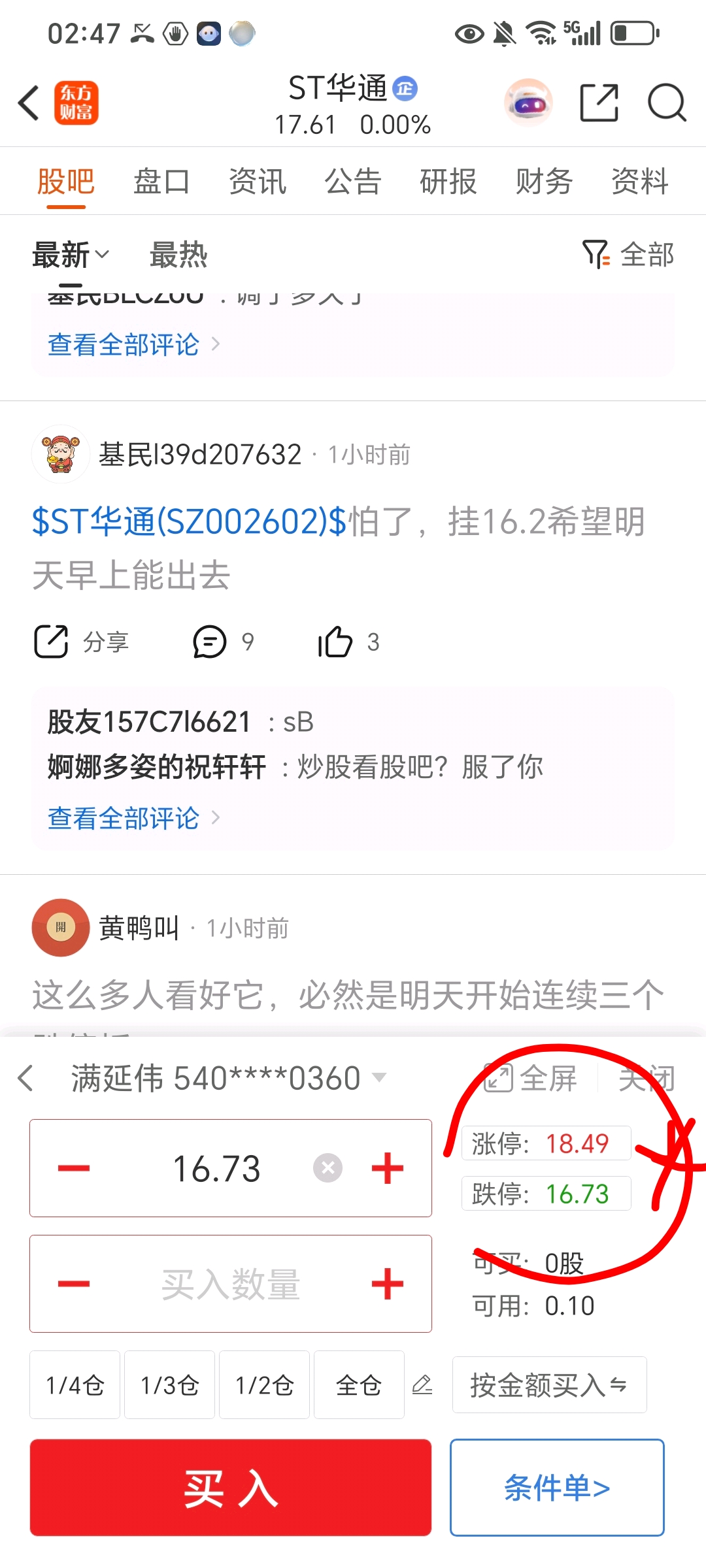 $ST华通(SZ002602)$ 股吧里,那些嚷嚷着要挂涨停价买入,跌停价卖出的人。出来几个告诉我一下,你们现在是怎么挂到明天的涨停价和跌停价的?要知道明天涨跌幅是十个点。可因为股票还在停牌期,系统涨跌幅都还是五个点。你们是怎么做到十个点涨跌幅挂单的?明天涨跌我不知道,但我知道嚷嚷着要提前挂涨跌停交易的,都是一群没有没有底线和最起码操守的东西。