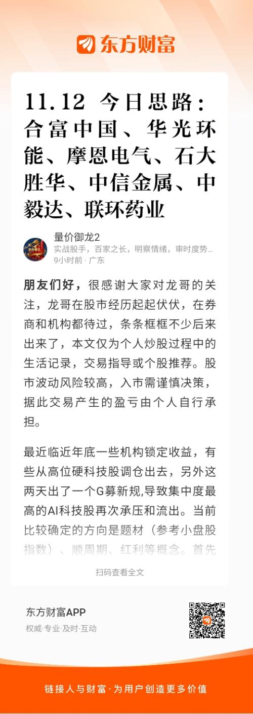 最近临近年底一些机构锁定收益,有些从高位硬科技股调仓出去,另外这两天出了一个G募新规,导致集中度最高的AI科技股再次承压和流出。当前比较确定的方向是题材(参考小盘股指数)、顺周期、红利等概念。首先小盘股指数的每天新高是市场最好的体现,也该吃一些小票了,而且11-12这段时间是小票的黄J时间段,小盘股迎来蜜月期。另外妖股也开始不断上演淘汰和晋级,合富、摩恩有妖王气质,可惜摩恩我们擦肩而过。要抓标的记得要么抓首板,要么抓最强票。