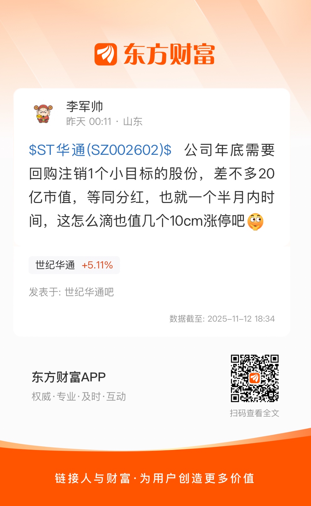 $ST华通(SZ002602)$ 公司年底需要回购注销1个小目标的股份,差不多20亿市值,等同分红,也就一个半月内时间,这怎么滴也值几个10cm涨停吧