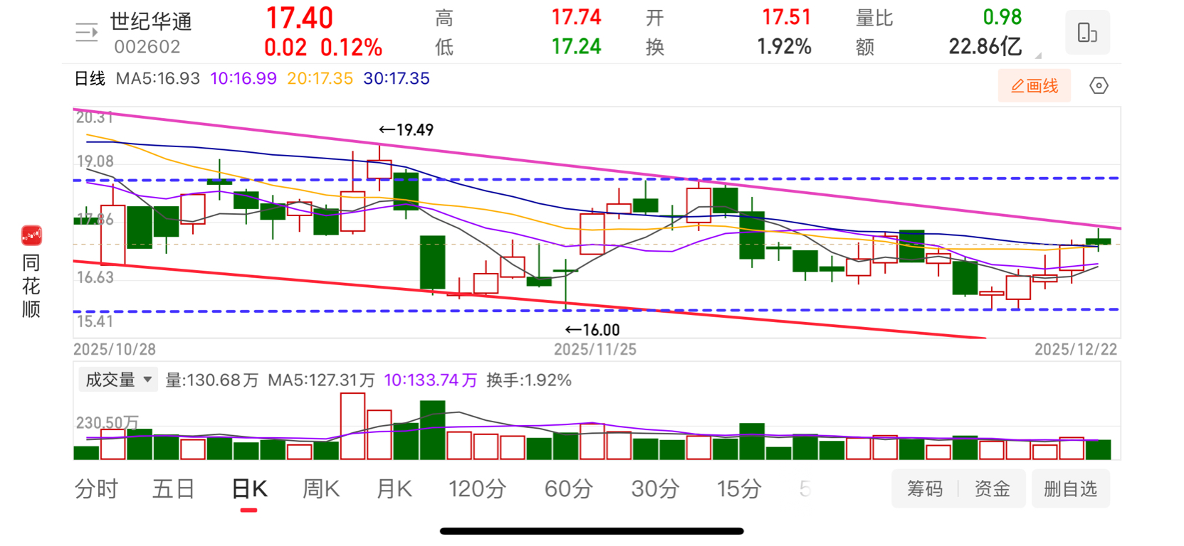 $世纪华通(SZ002602)$ 华通没什么好说的,,大家自己看就行了,今天预期是一样的,本来早盘放量了,量能未能持续,也成功到了我标注的位置,未能站稳,上周五我就卖了些,等机会吧