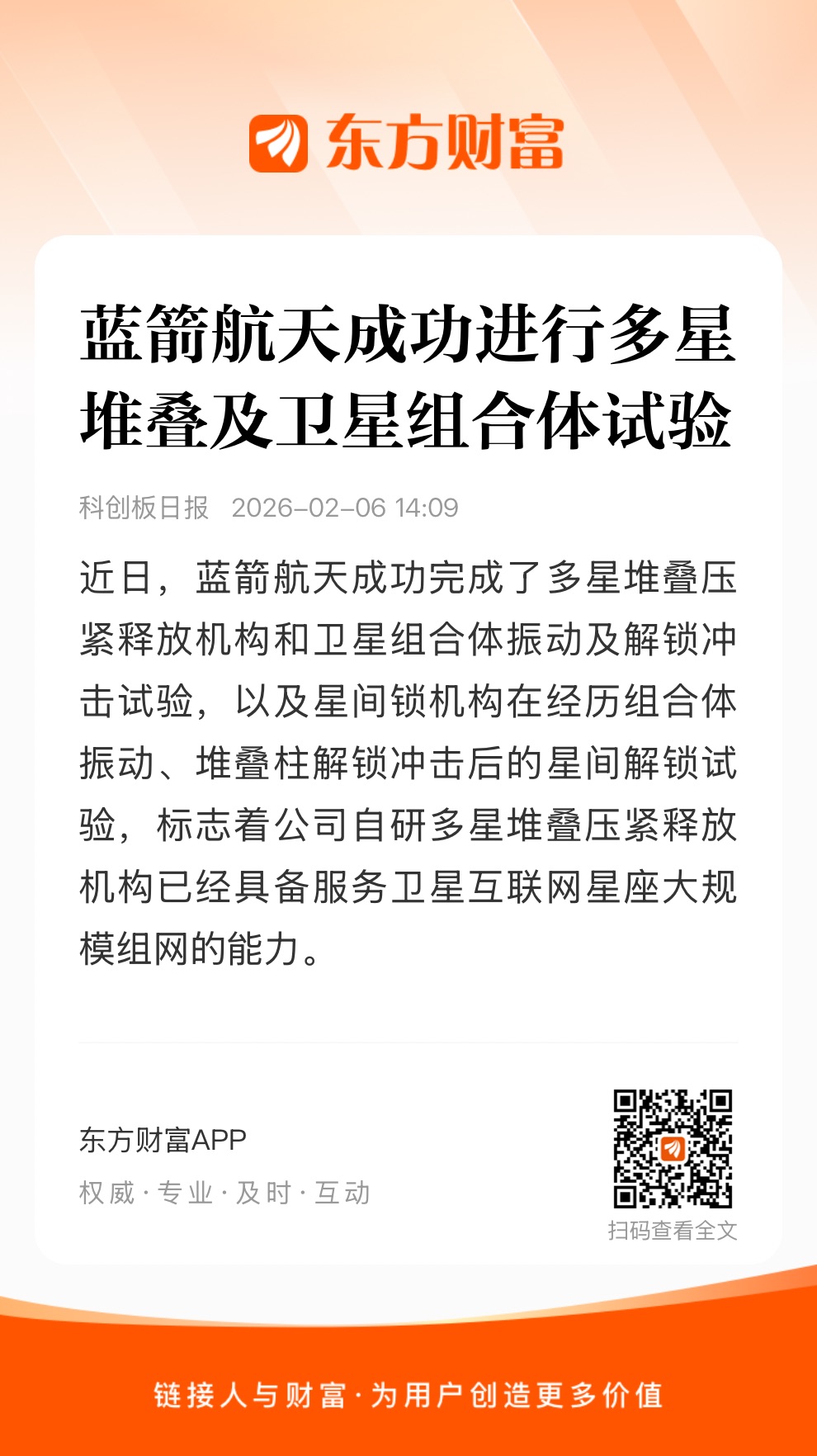 近日,蓝箭航天成功完成了多星堆叠压紧释放机构和卫星组合体振动及解锁冲击试验,以及星间锁机构在经历组合体振动、堆叠柱解锁冲击后的星间解锁试验,标志着公司自研多星堆叠压紧释放机构已经具备服务卫星互联网星座大规模组网的能力。