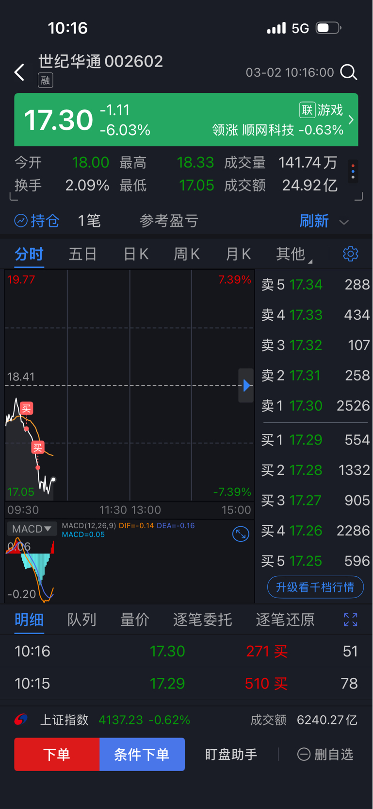 $世纪华通(SZ002602)$ 哎连跌五天了