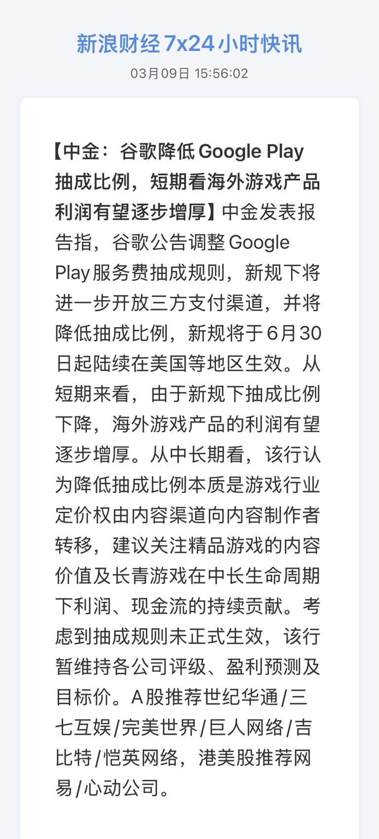 $世纪华通(SZ002602)$ 中金:谷歌降低Google Play抽成比例,短期看海外游戏产品利润有望逐步增厚