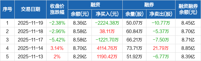 融资方面,当日融资买入5235.18万元,融资偿还7459.56万元,融资净偿还2224.38万元。融券方面,融券卖出1800股,融券偿还10.95万股,融券余量50.07万股,融券余额944.32万元。融资融券余额合计8.45亿元。
