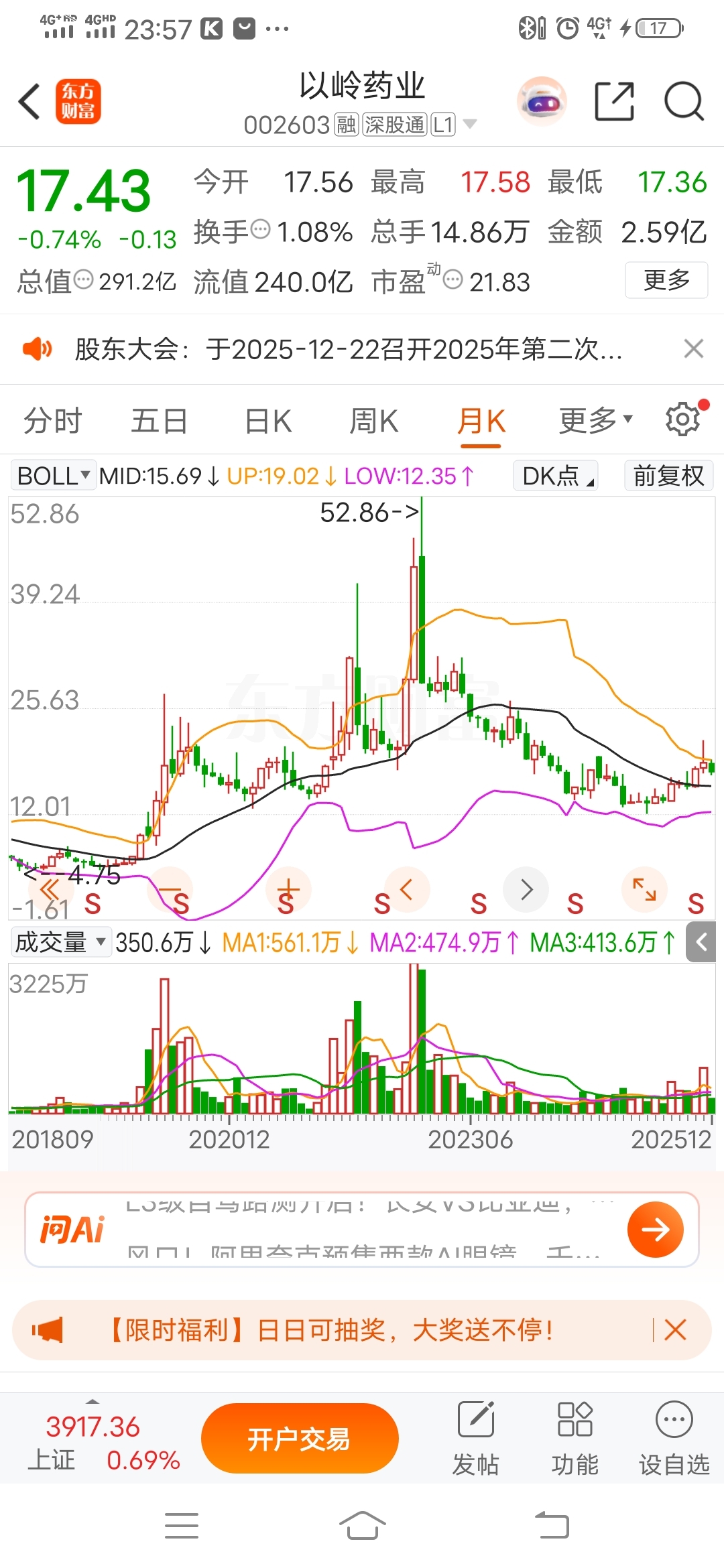 $以岭药业(SZ002603)$ 跌到15.5到月线中轨就买点