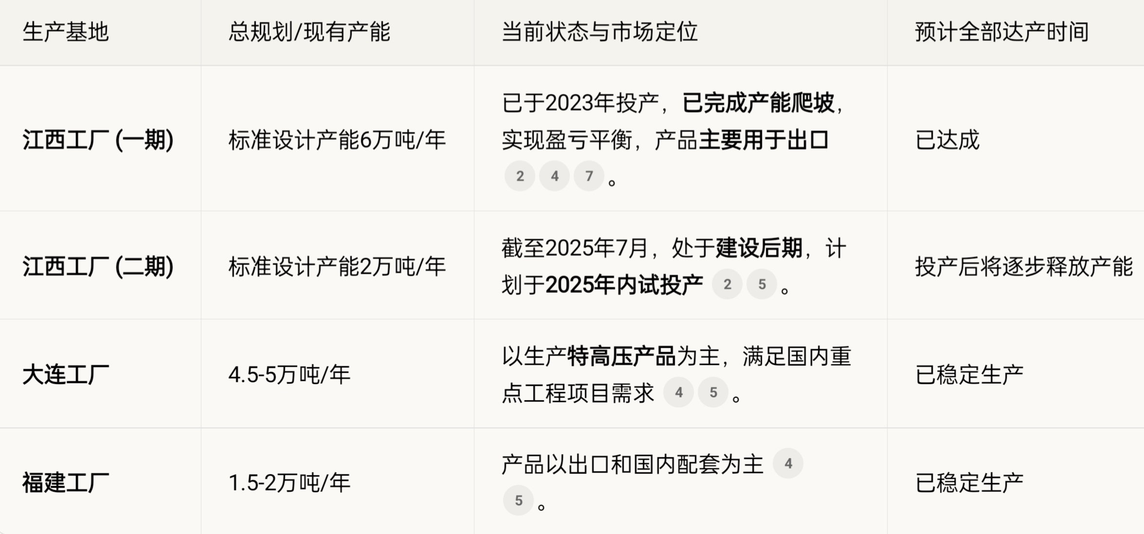 不过我注意到显示江西工厂一期在2025年1月已完成产能爬坡,这意味着一期已经实现稳定生产。而和还提供了各基地的产能分布细节,这些信息对理解整体产能布局很有帮助。
