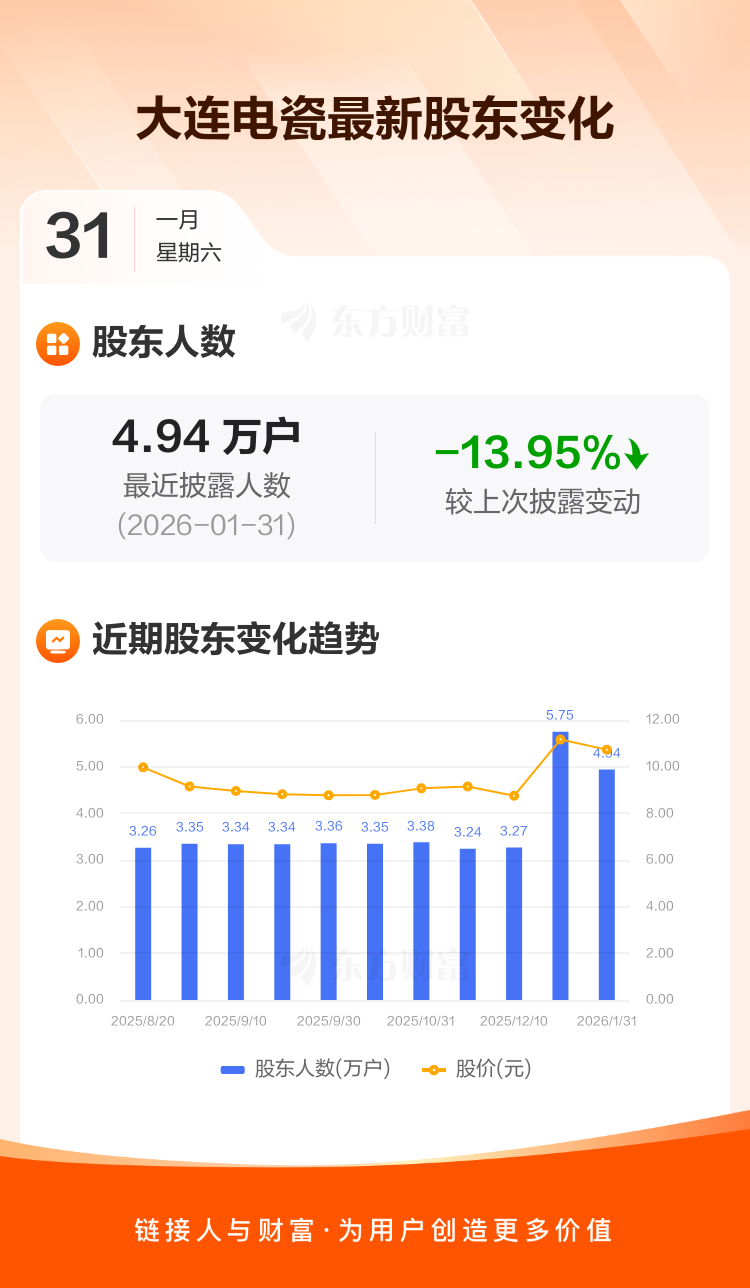 大连电瓷:截至1月31日最新股东户数4.94万户,较上期减少13.95%